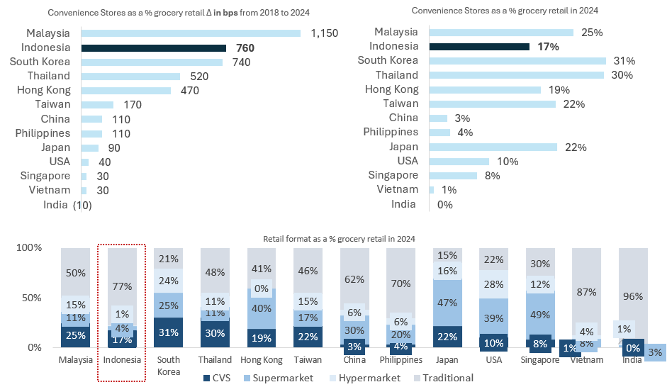 - Within modern trade, CVS tend to work better than supermarkets and hypermarkets in Indonesia because 1) its 17,500+ islands mean many low-density cities and rural areas (especially outside Java), where larger format retail cannot achieve viable unit economics like in dense urban markets such as Singapore or many US cities. 2) Furthermore, lower purchasing power in Indonesia drives frequent shopping with smaller baskets, a pattern well-suited to CVS formats.